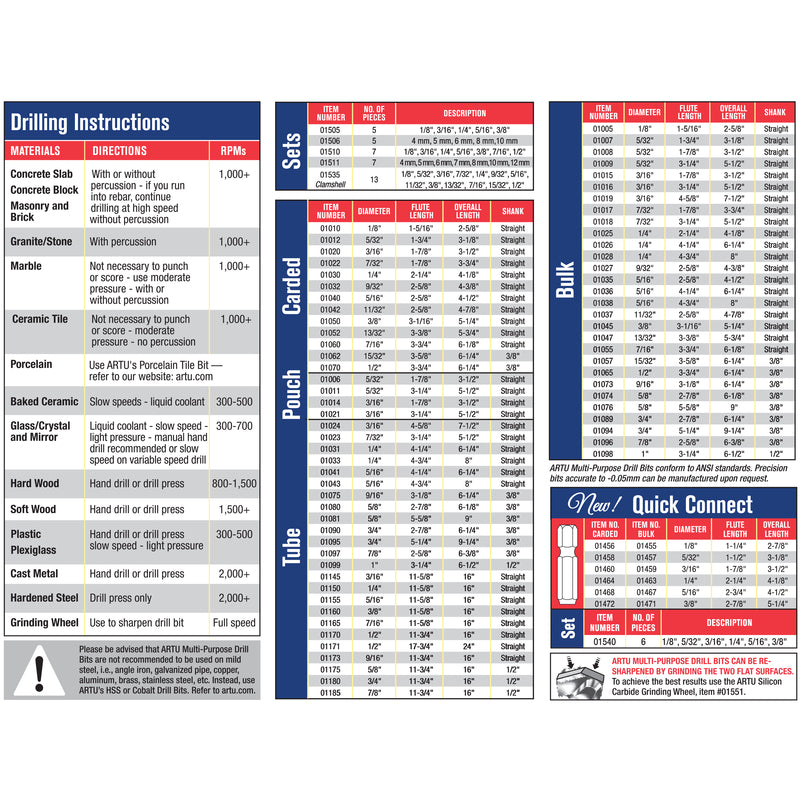 - Applications: Drills through, Brick, Ceramic Tile, Composites, Fiberglass, Flagstone, Slate, Cement Board, Masonry, Concrete, Laminates, Marble, Plexiglass, Plaster, Plywood, PVC, Reinforced Cement, Concrete Block, Glass, Soft Wood, Hard Wood, Granit
