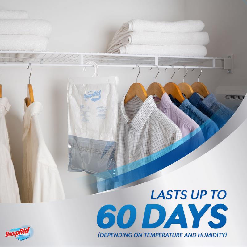 DampRid Hanging Bag Moisture Absorbers attract and trap excess moisture out of the air. Think of it as a dehumidifier without electricity, absorbing excess moisture to create and maintain optimal humidity levels and inhibiting mold and mildew. DampRid Hanging Bag Moisture Absorbers are ideal for closets, but they're also great for laundry rooms and storage areas where clothes and other fabrics often collect unpleasant, musty odors. These DampRid Moisture Absorbers offer 10% more moisture absorbing power compared to 14-ounce bags and can last up to 60 days depending on the temperature and level of humidity. When the liquid in the bag reaches the replacement indicator line, simply discard and replace.