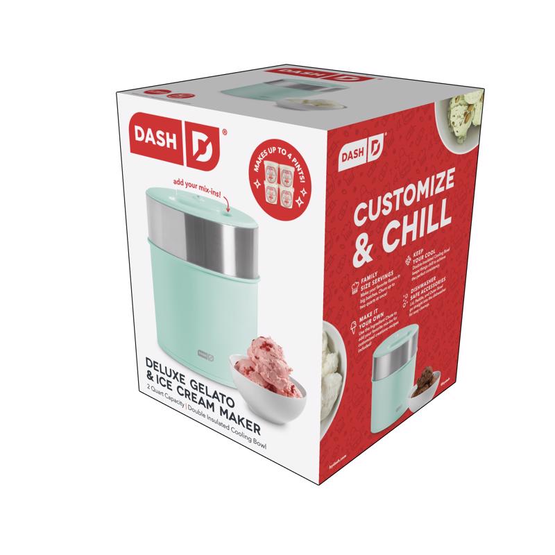 When they all scream for ice cream, your kitchen can become the coolest ice cream parlor in town with the Dash Deluxe Ice Cream Maker! Easily churn up two quarts of ice cream at once, big batches that are perfect for parties and family gatherings. Start your frosty adventure by freezing the double-insulated cooling bowl for 24-48 hours. Then, chill ingredients for your favorite flavor and start churning with one touch. Mid-churn, use the ingredient chute to toss in whatever your sweet tooth is calling for decadent - chocolate chips, cookie crumbles, nuts, and even swirls of caramel. Craving a firmer texture or want to save some scoops for later? Just pop your ice cream into the freezer to achieve the perfect consistency. Use our included recipe guide to go dairy-free or make healthier versions of your favorite frozen treats. From frozen yogurt to sorbet, ice cream to gelato, everyone can have the ice cream of their dreams.