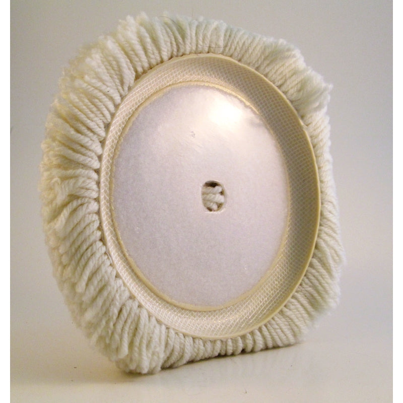 7.5 inch velcro /bolt-on compound pad with 1-1/4 inch pile 100% twisted wool curved edge gives a high gloss finish. Twisted 100% wool ideal for compounding. Fits 7 inch backing pads. Top quality.