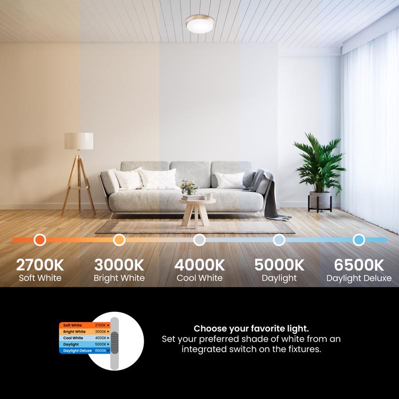 Upgrade your lighting to the Feit Electric Adjustable White LED ceiling fixture. This modern fixture offers the perfect blend of style and functionality. It features a brushed nickel finish and a frosted lens to complement any contemporary space without feeling bulky. Easily mount it flush against your ceiling for a clean look. Integrated, dimmable LEDs deliver bright, flicker-free light. Adjustable White light lets you preset your preferred color temperature using the toggle on the fixture. Match your current lighting or set the perfect mood for any space. Save money on your energy bill with this energy-efficient fixture. Its low energy use and long lifespan of 50,000 hours means fewer light replacements. The Feit Electric Adjustable White ceiling light is perfect for kitchens, bedrooms, living areas, offices, and anywhere you need beautiful, versatile lighting.