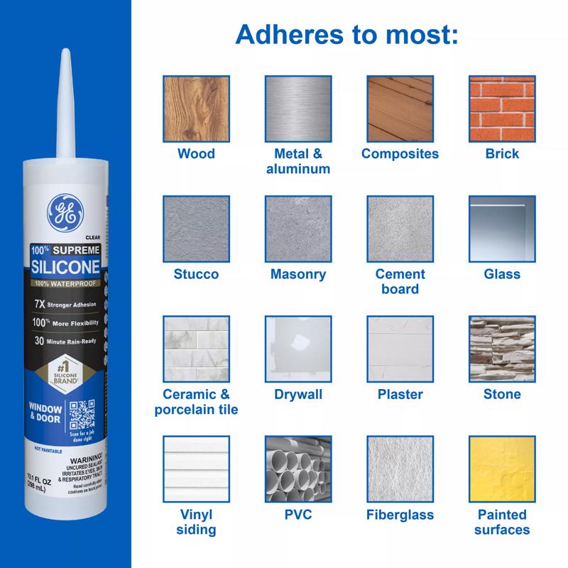 GE Supreme Silicone Window and Door sealant is a 100% waterproof sealant that can provide a reliable seal in weather-prone areas such as windows, doors, basements, roofs, sidewalks, siding, tuckpointing, and attics. Our sealant also has a 30-minute rain ready formula and resists stain causing mold and mildew growth. This 100% silicone sealant offers 40% more flexibility than Class 25 sealants and 7X stronger adhesion than our Silicone 1 sealant. Plus, it offers 50% joint-movement capabilities without cracking, shrinking, breaking down, or washing away. GE Supreme Silicone Window and Door sealant has a low odor that's ideal for interior applications, and it won't discolor most high-end metal finishes such as chrome, bronze, and nickel.