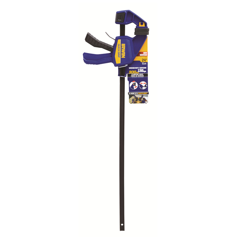The IRWIN QUICK-GRIP SL300 One-Handed Bar Clamp provides up to 300 lbs. of sustained clamping force that is evenly distributed through locking swivel jaws. It is constructed with an I-beam bar to reduce flexing and bowing, and has a unique pistol grip design and quick-release trigger for onehanded operation. This clamp easily converts to a spreader with a few simple turns of a Quick-Change screw.