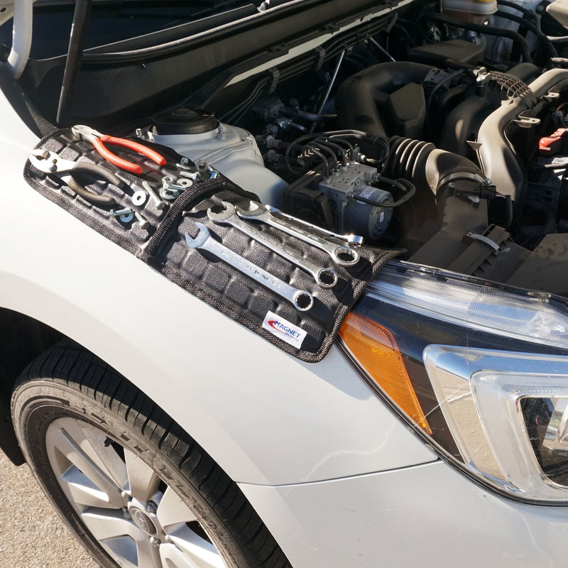 The Magnetic Tool Mat is a flexible magnetic mat designed for holding tools and small parts secure in the workshop, garage or on the jobsite. It is magnetic on both sides to attract to any flat or curved ferrous metal surface. A mobile tool rack to keep your tools and parts with you while you are working, helping you stay organized and work fast.