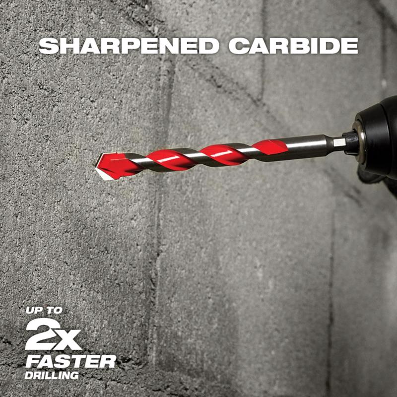 Our Carbide Hammer Drill Bits use sharpened carbide to deliver and up to 2x faster drilling into masonry material. Engineered with a precision ground tip, these bits deliver faster starts and less walking when drilling into concrete, brick and block. The carbide-tipped masonry drill bits' wide flute design removes dust faster, reducing heat and delivering more holes per charge.