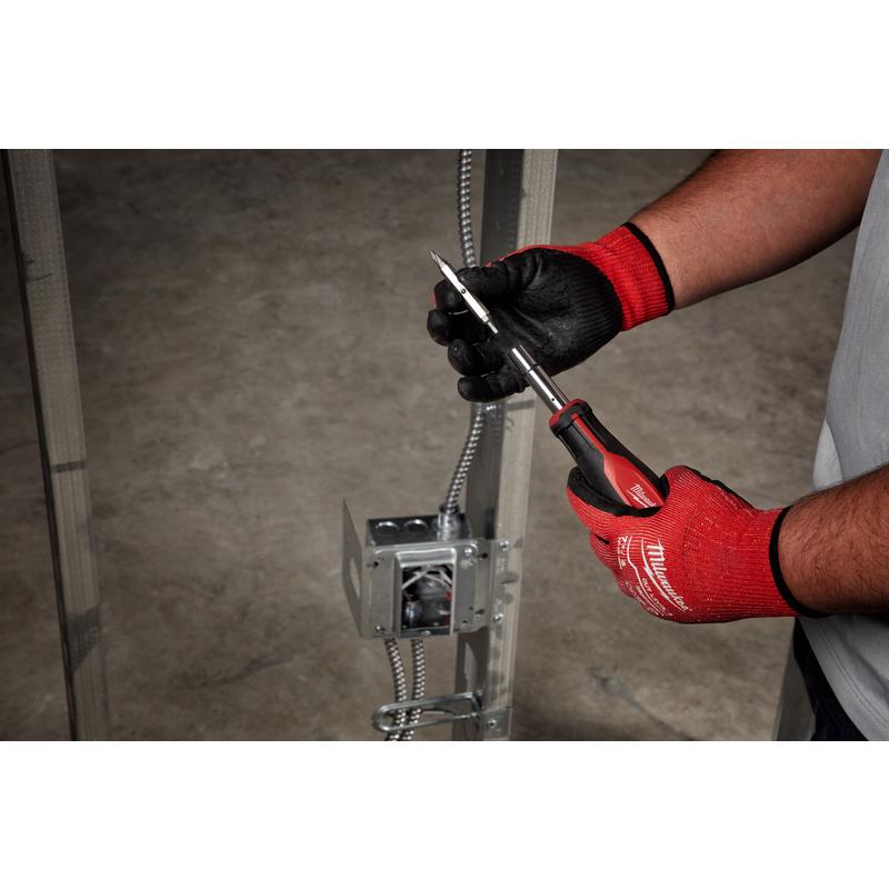 The Milwaukee 11-in-1 Multi-Tip Screwdriver with Square Drive Bits includes the 8 bits and 3 nut drivers most requested by professionals. The variety of screwdriver bit types and screwdriver nut drivers offer the versatility needed to complete any job. The bit prevents bit wear from hardened screws and extends bit life when fastening specialty screws found in electrical boxes, conduit couplers, outlets and other common jobsite fixtures. The multi-tip screwdriver is equipped with visible ID markings for quick tool identification and tri-lobe handle grips for maximum comfort.