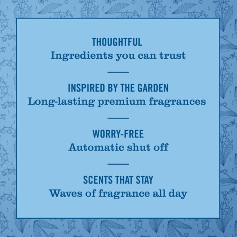 Mrs. Meyer's Plug-In Scented Oils bring the feeling of open windows and fresh air into your home-with safe, simple ingredients you can trust. Rain Water Scent is watery, fresh and floral. Breathe easy. Feel refreshed. Let nature-inspired fragrance do the rest.