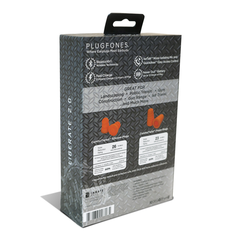Plugfones Liberate 2.0: Earplugs with Audio. The Liberate 2.0 features interchangeable safety-rated earplug tips with SoundSeal Noise-Suppressing Technology, which acts as a barrier between you and everything you don't want to hear. With a 12-hour battery, fast charge technology and Bluetooth 4.1 you get the crystal-clear audio you want + the protection you need without all the tangles. The built-in Isotalk Noise Isolating Mic and Quickdraw Easy Access Control make it simple to take calls and control your audio as you work.