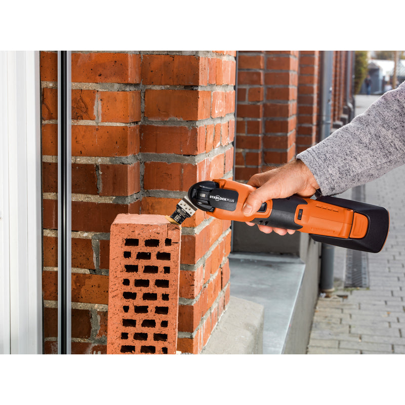 The all NEW FEIN E-Cut Carbide PRO multi-tool blade cuts through what others cant. With titanium coated bi-metal carbide teeth and a TiN coating that helps the blade last 30x longer than traditional bi-metal blades, cutting through difficult materials has never been easier. The stainless steel construction of the Starlock mount and the high quality, high strength welds help to deliver optimal power transfer. It's the perfect choice for hard materials such as ferrous metals, stainless steel or copper pipes. Can even be used for tempered screws (Spax) and high-strength machine screws. Also ideal for abrasive materials like brick, masonry and cement fiber slabs, not to mention laminate, CFRP and GFRP. Strong cutting performance and cutting quality in all wood materials such as hardwood and particle board.