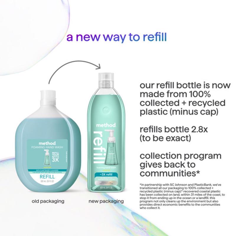 Just another classic fill-good story. in this tale, method foaming hand wash meets its ultimate sidekick - the 28 oz. waterfall refill. with notes of cool, cascading water lily and sandalwood, this innovative refill uses 71 percent less plastic compared t