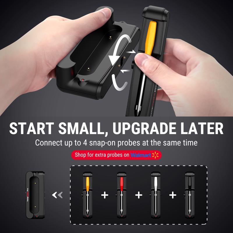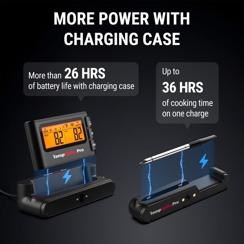 The TempSpike Pro WIFI Hub Meat Thermometer features two ultra-thin probes, each with 3 internal sensors and 1 ambient sensor for exceptional precision. Designed to grow with your needs, it supports up to 4 probes if you choose to purchase more add-on probes. With dual WiFi and Bluetooth 5.2, enjoy stable monitoring anywhere, indoors or out. Durable ceramic handles withstand 1050 deg. F, and IP67 waterproofing ensures dishwasher safety. The app offers real-time alerts, recipes, and USDA presets for effortless cooking. With a modular, rechargeable design (BOOSTER - 20+ hours, probes - 36+ hours), it's perfect for beginners and pros tackling big cookouts.