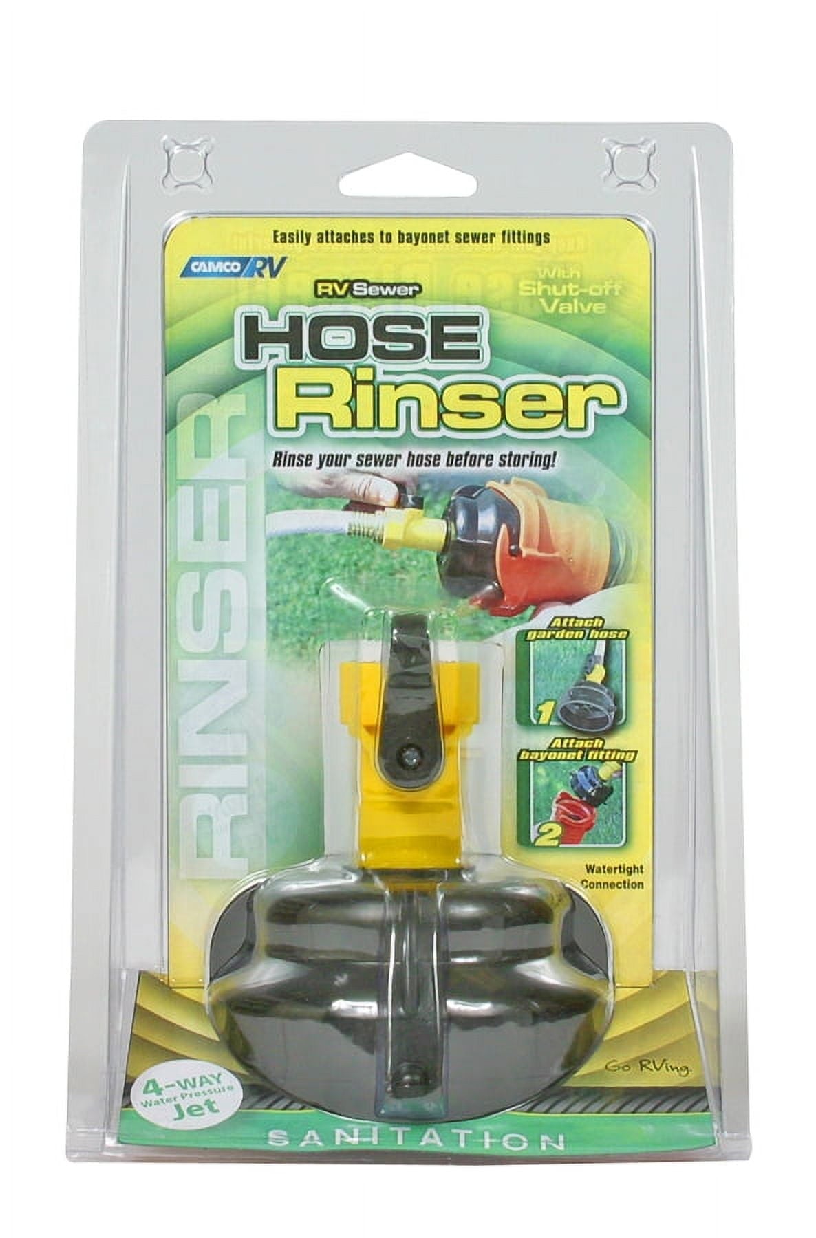 Sewer Hose Rinse Cap thoroughly rinse your sewer hose before storing. Locks onto bayonet fitting securely and connects to a garden hose. Fitting attaches to sewer hose, then hooks to any standard water hose to create a powerful spray that helps reduce odors and clean sewer hoses.