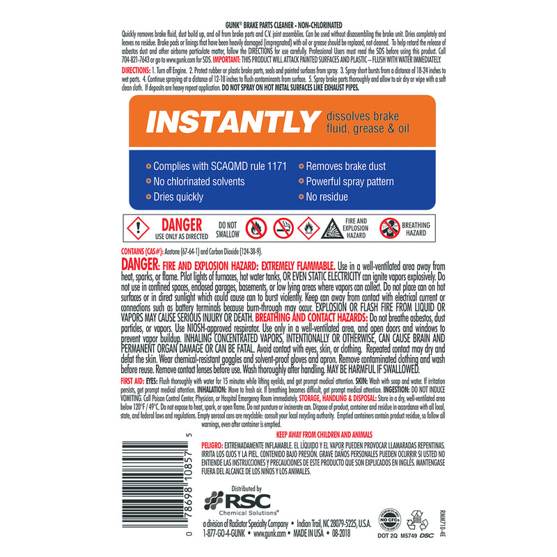 Quickly removes brake fluid, dust build-up and oil from brake parts and C.V. joint assemblies. It can be used without disassembling the brake unit. Dries completely and leaves no residue. Brake pads or linings that have been damaged (impregnated) with oil or grease should be replaced, not cleaned. To help retard the release of asbestos dust and other airborne particulate matter.
