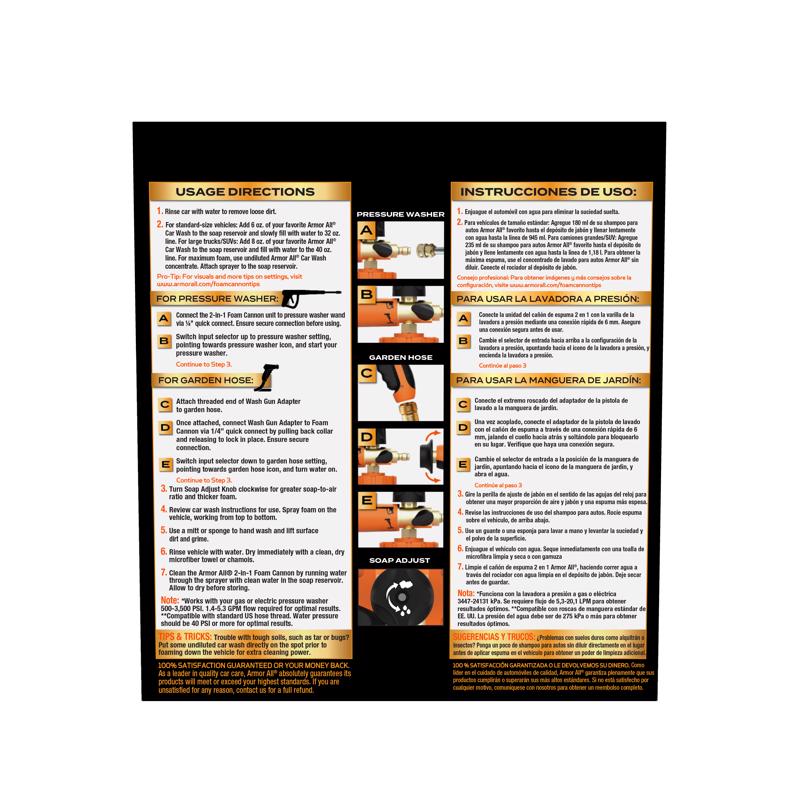 Armor All 2-in-1 Foam Cannon kit is an innovative car care kit that produces high-foaming results for a fun, easy way to remove dirt and grime from your vehicle. This kit includes one foam cannon, one garden hose adaptor, and one pressure washer adaptor.