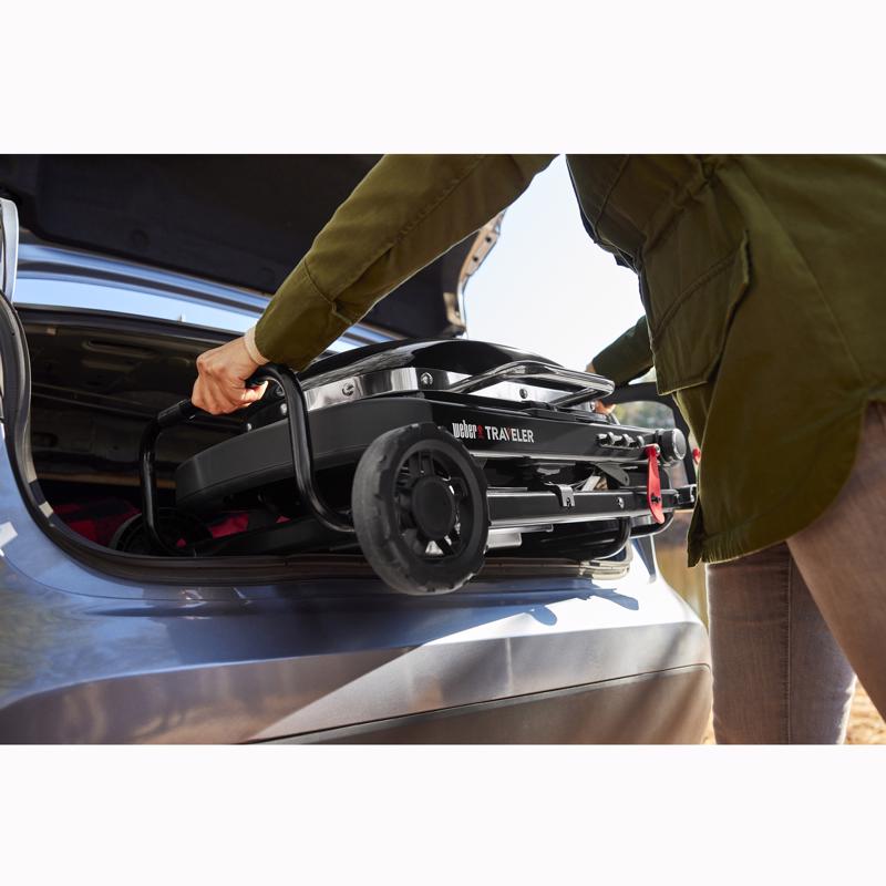 Make grilling part of your next outdoor adventure with the Weber Traveler Compact Portable Gas Grill. At 32in wide and only 37 pounds, it's 20% smaller than the original Weber Traveler Grill and fits easily into the trunk of most compact cars. Sturdy one-piece design with automatic lid lock makes it easy to take anywhere, from trail to tailgate. Raise the grill with one hand and get cooking, with plenty of room to make a meal for four.