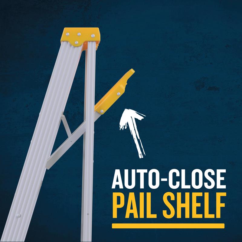 The 366 Aluminum 6 ft Step Ladder has a duty rating of 250 pounds and Tool-Tra-Top that feature a convenient tray for holding tools or a paint can and slots for a paint roller tray. There is also a sturdy molded paint can hanger on the back of the top. The automatic Spill-Proof pail shelf opens and closes with the ladder. The Traction-Tred steps are slip resistant.