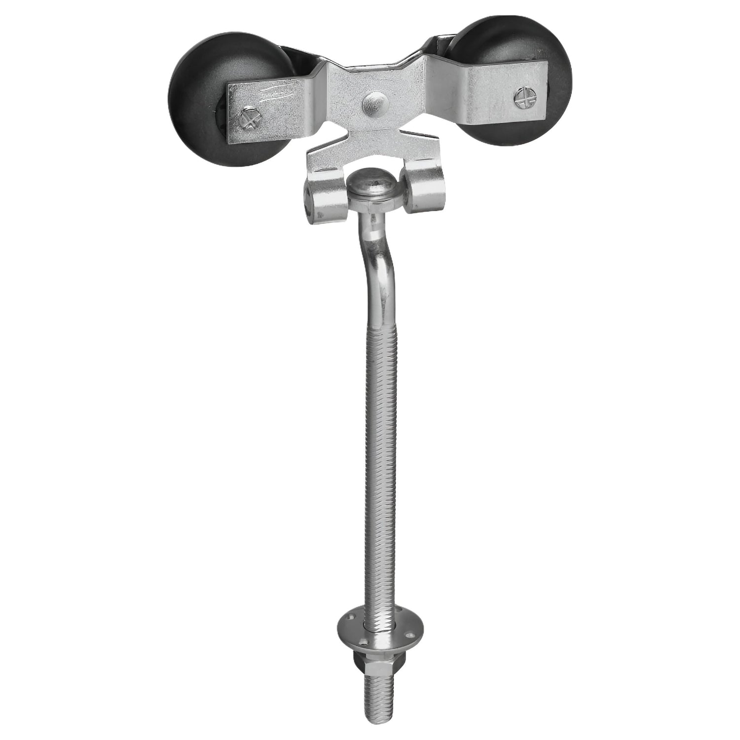 The 1/2 inch offset 9 inch bolt (with 7 inch thread) adjusts door vertically and laterally (1 inch) from inside building.