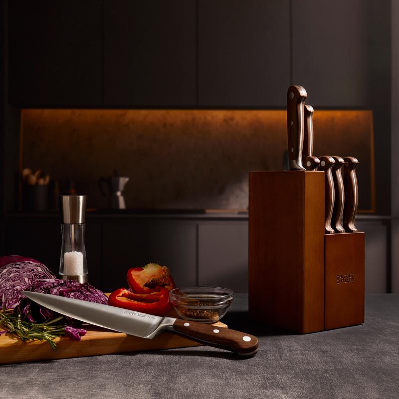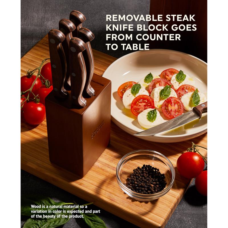 Beautiful walnut handles with triple-rivet construction provide a comfortable grip, while the high-carbon stainless steel blades resist stains. Our signature 26-Degree Taper Grind edge is designed for precise cutting and easy sharpening. In addition to the core set of knives you need for food prep, the set includes 6 matching steak knives. The wood block securely holds the knives and includes a separate steak knife block that looks beautiful on the table.