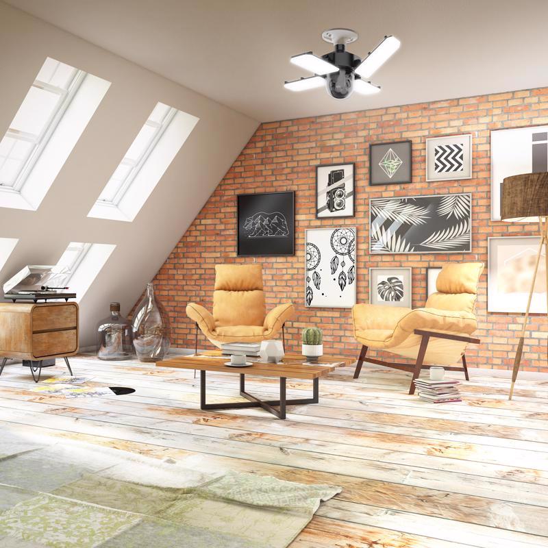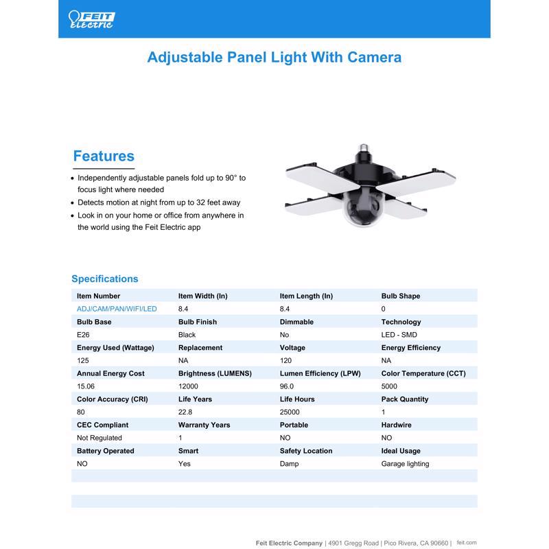 Protect your property and always know what's going on at home with the Feit Electric ADJCAMPANWIFI/LED/RP Smart Adjustable Panel Light with Pan and Tilt Camera. This Adjustable Panel Light with built-in camera installs directly into a standard E26 base to provide 12000 lumens of 5000K light using only 125 watts of energy. The built-in pan and tilt camera records in 1080p HD video which can be viewed live directly from the Feit Electric app or your compatible Amazon Alexa And Hey Google Smart Assistants. Recorded events can also be stored on a separately sold SD Card to be transferred and archived to any other storage devices. Get alerts and notifications whenever movement is detected and even interact if needed with the two-way voice-enabled built-in microphone and speaker. The Adjustable Panels can work as a spot or flood light by unfolding to be flat or by folding up 90 degrees to point the lights horizontally ensuring that your scene is always properly lit. Built-in Infrared Night Vision mode allows you to see up to 32 feet in the dark and the camera can be tilted and panned directly via the app.