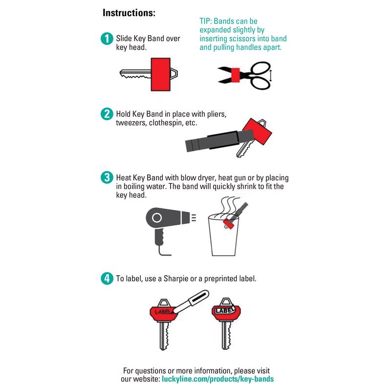 Easily identify your keys with these color-coded, write-on key identifiers. Bands are made of heat-shrink plastic and separate keys by color. Slide band over key head and apply heat. Band shrinks to form-fit the key head, providing a writable surface. To label, use a Sharpie or a preprinted label. Ideal for awkwardly shaped keys, when standard key caps will not work. Size Medium is ideal for standard size keys, such as house keys. Size Large is ideal for larger-headed keys, such as office keys.