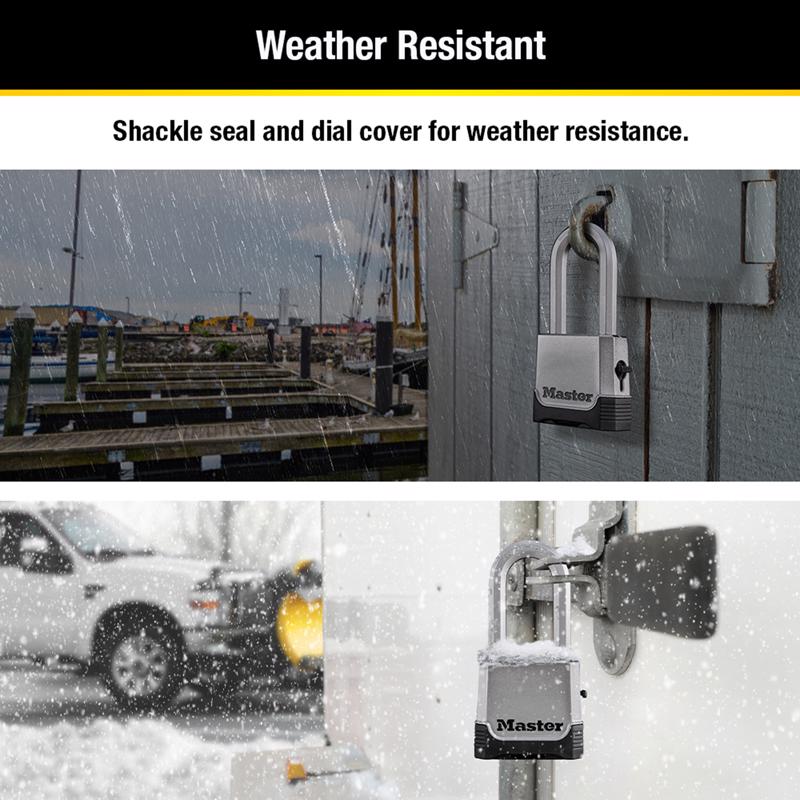 Offering maximum strength, weather protection, and versatility, the Master Lock Co. Magnum steel resettable combination padlock contains a laminated steel core. Its covered keyway offers superior weather protection while a set-your-own combination padlock provides keyless convenience.
