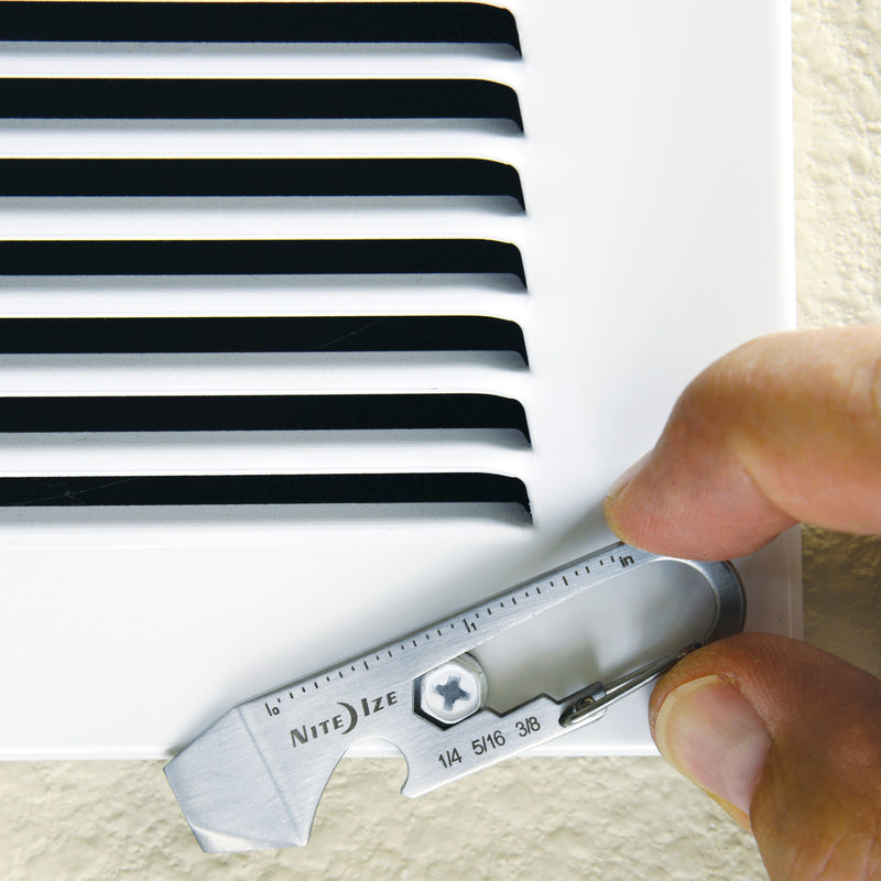 Made of durable stainless steel, the Nite Ize DoohicKey features a half-dozen tools that do everything from tighten bolts and screws to open a bottle of refreshment, all in a simple key tool that fits in the palm of your hand. On one end of the DoohicKey is a sturdy carabiners clip, allowing you to attach keys to it or attach the DoohicKey itself to any loop or ring. Opposite the clip is an etched ruler for on-the-spot measurements and the carabiners opening is strategically shaped to function as a wrench. On the other end, the DoohicKey features a bottle opener, a flat head screwdriver and a box cutter. With a streamlined, clever design that makes it easy to carry, attach, remove and reattach, it's always as at-hand as it is handy.