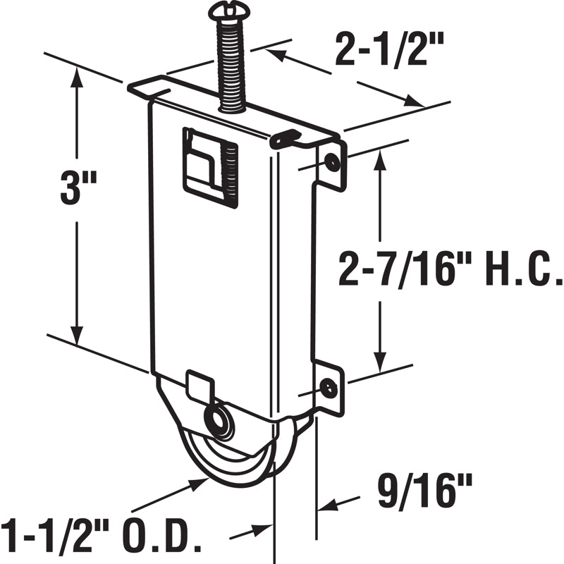 This is a paneled mirror door roller assembly with a concave nylon roller. Used on Monarch Mirror Doors L-Series. The grooved ball bearing nylon roller provides a smooth ride as it slide back and forth. The flat nylon roller is 1-1/2 in. in diameter. Note that the adjusting screw is centered on the top of the housing and the tabs on either side will insert into slots on that side and will be held in place by the existing screws.