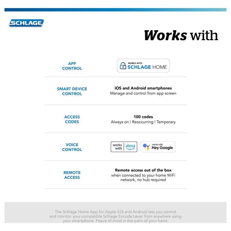 The Schlage Encode Smart WiFi Lever brings easy and secure access to even more doors throughout your home. Seamlessly control and monitor your home from anywhere when connected to your homes WiFi network and paired with the Schlage Home app, no additional accessories are needed. Conveniently schedule up to 100 access codes, view lock history, receive push notifications, pair with Amazon Alexa and Google Assistant for hands-free control, and so much more. It is certified highest in Security, Durability, and Finish by BHMA industry experts and backed by a century of trusted innovation and security from Schlage. It is ideal for garage and side doors or interior doors like offices or guest suites where secure, convent access control is desired - allowing your home to have smart access control inside and out.