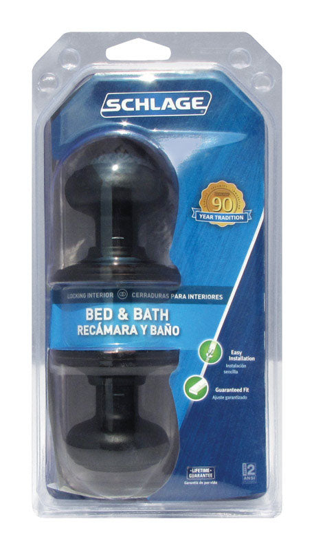 The Schlage Georgian aged bronze bed and bath knob exhibits warm, copper tones that break through its darker, aged exterior. Ideal for use on bathroom and bedroom doors where prohibited entry is sometimes desired, it's equipped with a push-button lock on the inside which can be disengaged from the outside with the included pin key. The universal design of this privacy knob set allows it to be mounted to left or right swing doors and the finish coordinates nicely with other aged bronze fixtures in your house for a cohesive look. The workmanship and lustrous finish certain to provide decades of dependable use and allure.