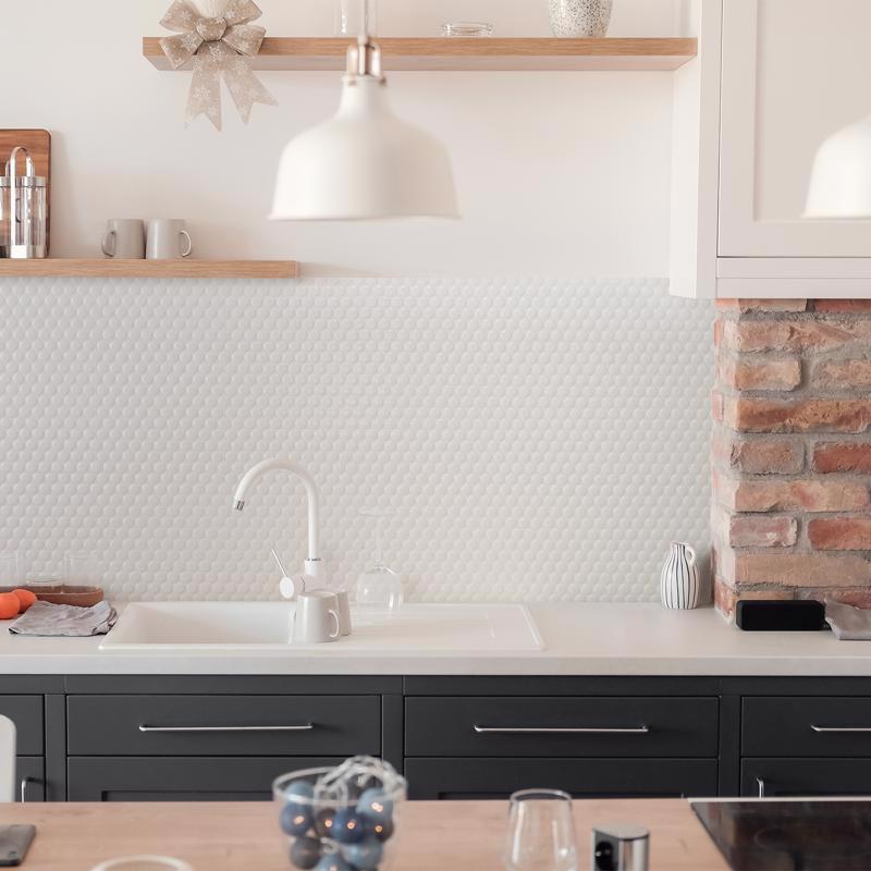 This white penny tile has all the timeless charm of classic models. The Romy adds a subtle texture and a certain je ne sais quoi to your decor. Pair it with materials like brick and blonde wood.