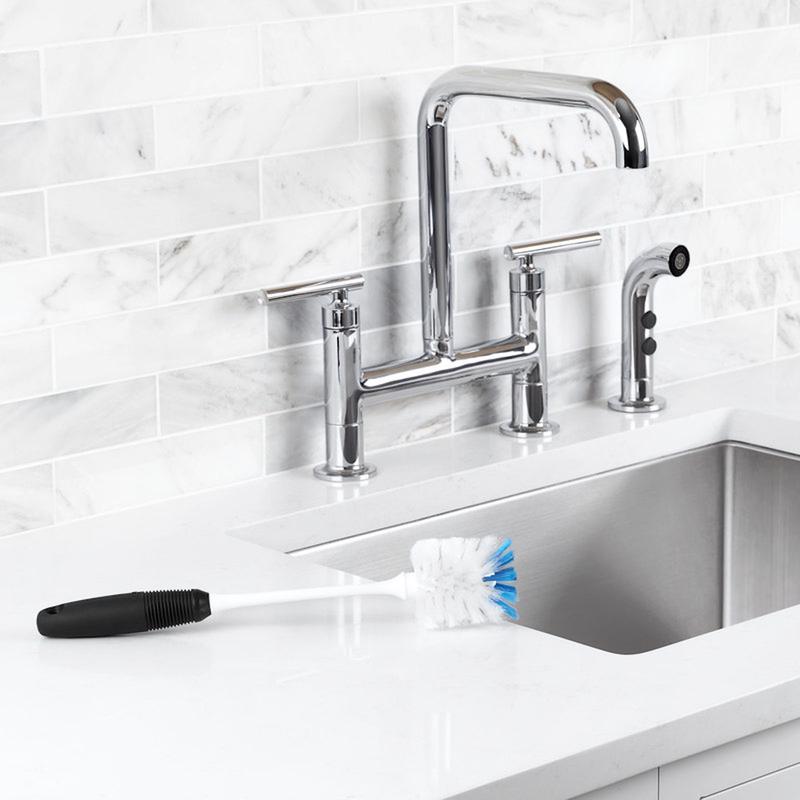 The specially shaped head scrubs sides, corners and bottoms and has durable, dual-action bristles made for heavy-duty cleaning without scratching. The long neck easily reaches inside bottles, pitchers and carafes, while the soft grip wont slip, even when wet.