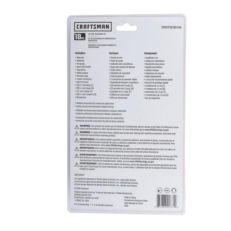 We're CRAFTSMAN, an authentic American icon. For nearly a century we have been the brand homeowners, home builders, auto enthusiasts and master mechanics trust. Today's CRAFTSMAN continues that legacy. The Craftsman 18-piece air tool accessory kit can be used for a variety of applications such as adding air to tires, inflating pool toys, connecting an air tool or hose to your compressor, using the blow gun to cleanup around your garage or shop, or using the couplings to connect two 1/4-in threaded parts such as hoses to increase length. Use the included thread sealant tape on male threads for airtight connections.