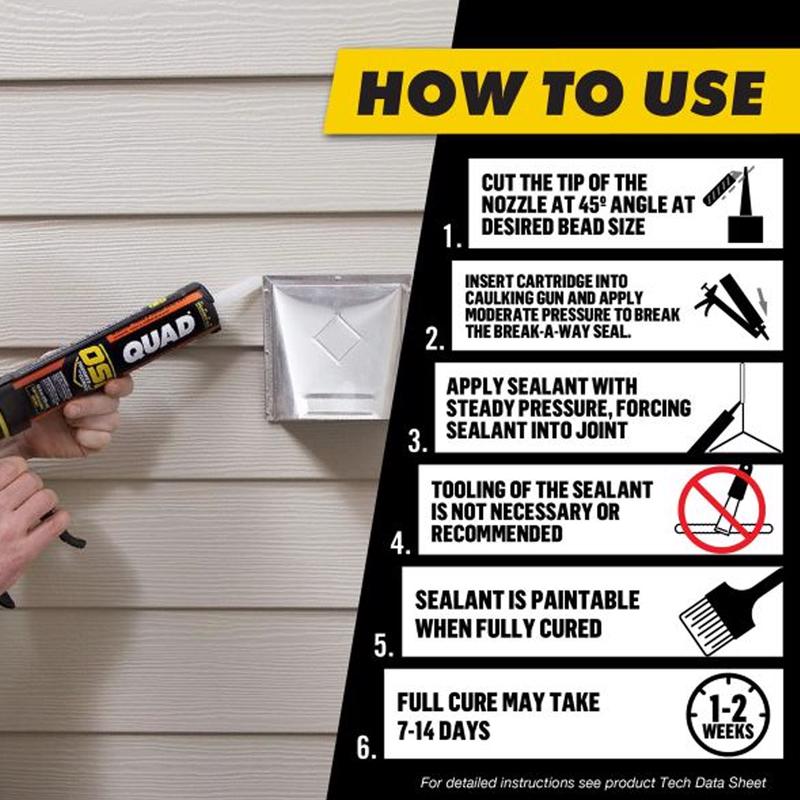 Arm yourself against the elements with OSI Quad Window, Door & Siding Sealant. OSI Quad Window, Door & Siding Sealant is an all-season formula designed for superior performance on exterior window, door and siding applications, fiber-cement and vinyl siding, PVC trim, and much more. It can be applied to wet or dry surfaces, even at freezing temperatures and, unlike other sealants, it resists dirt and dust collection, yellowing and water washout. OSI Quad bonds without a primer to most common substrates like cedar, painted or stained woods, fiberglass, vinyl, coated aluminum, steel, metal, brick, masonry and concrete. With resistance to UV and extreme temperatures (20 deg F to 120 deg F) and proven wet surface application, OSI Quad is the versatile and durable choice for professional contractors. OSI Quad is self-tooling and once cured is paintable with latex paints. Our color specialists work closely with leading window, door and siding manufacturers to ensure perfect color matches. OSI Quad is composed of elastomeric polymers and high quality synthetic resins. OSI offers an arsenal of adhesives, caulks, and outdoor construction sealants for the true professional. OSI: Tougher Than the Elements.