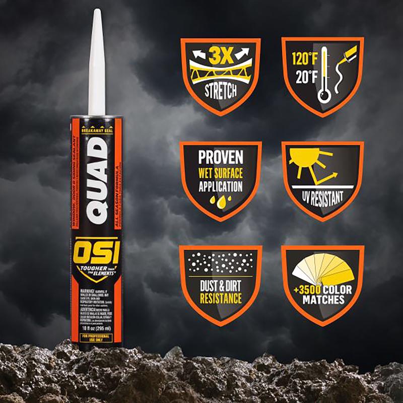 Arm yourself against the elements with OSI Quad Window, Door & Siding Sealant. OSI Quad Window, Door & Siding Sealant is an all-season formula designed for superior performance on exterior window, door and siding applications, fiber-cement and vinyl siding, PVC trim, and much more. It can be applied to wet or dry surfaces, even at freezing temperatures and, unlike other sealants, it resists dirt and dust collection, yellowing and water washout. OSI Quad bonds without a primer to most common substrates like cedar, painted or stained woods, fiberglass, vinyl, coated aluminum, steel, metal, brick, masonry and concrete. With resistance to UV and extreme temperatures (20 deg F to 120 deg F) and proven wet surface application, OSI Quad is the versatile and durable choice for professional contractors. OSI Quad is self-tooling and once cured is paintable with latex paints. Our color specialists work closely with leading window, door and siding manufacturers to ensure perfect color matches. OSI Quad is composed of elastomeric polymers and high quality synthetic resins. OSI offers an arsenal of adhesives, caulks, and outdoor construction sealants for the true professional. OSI: Tougher Than the Elements.