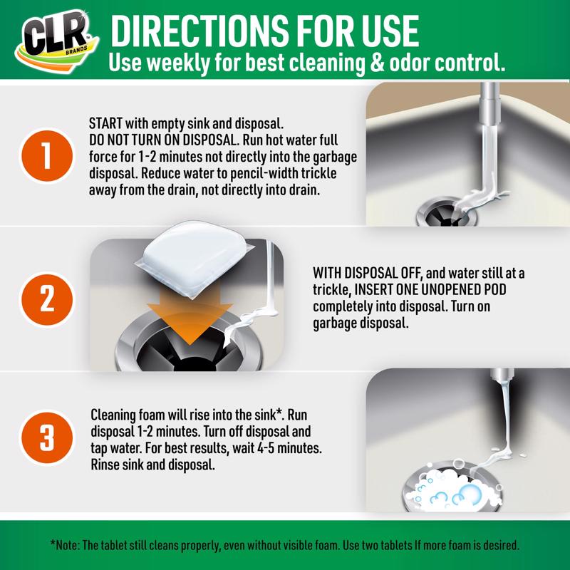 Your garbage disposal and sink can be a major source of odor in your kitchen. Knock out those rotten smells with CLR Fresh and Clean Disposal. Each bag comes with 5 pods that quickly dissolve and begin foaming, filling every part of your garbage disposal with our specially formulated cleaner that cuts through odor causing residue and leaves your sink and disposal smelling fresh. For best results run the disposal until the foaming cleaner has risen out of the drain and retreated back into the kitchen sink disposal. This will ensure that the cleaner has reached every part of the food disposal. CLR has been a trusted household cleaner for over 30-years with a whole line of house cleaning supplies that help remove stains, buildup and grime from every part of your home.
