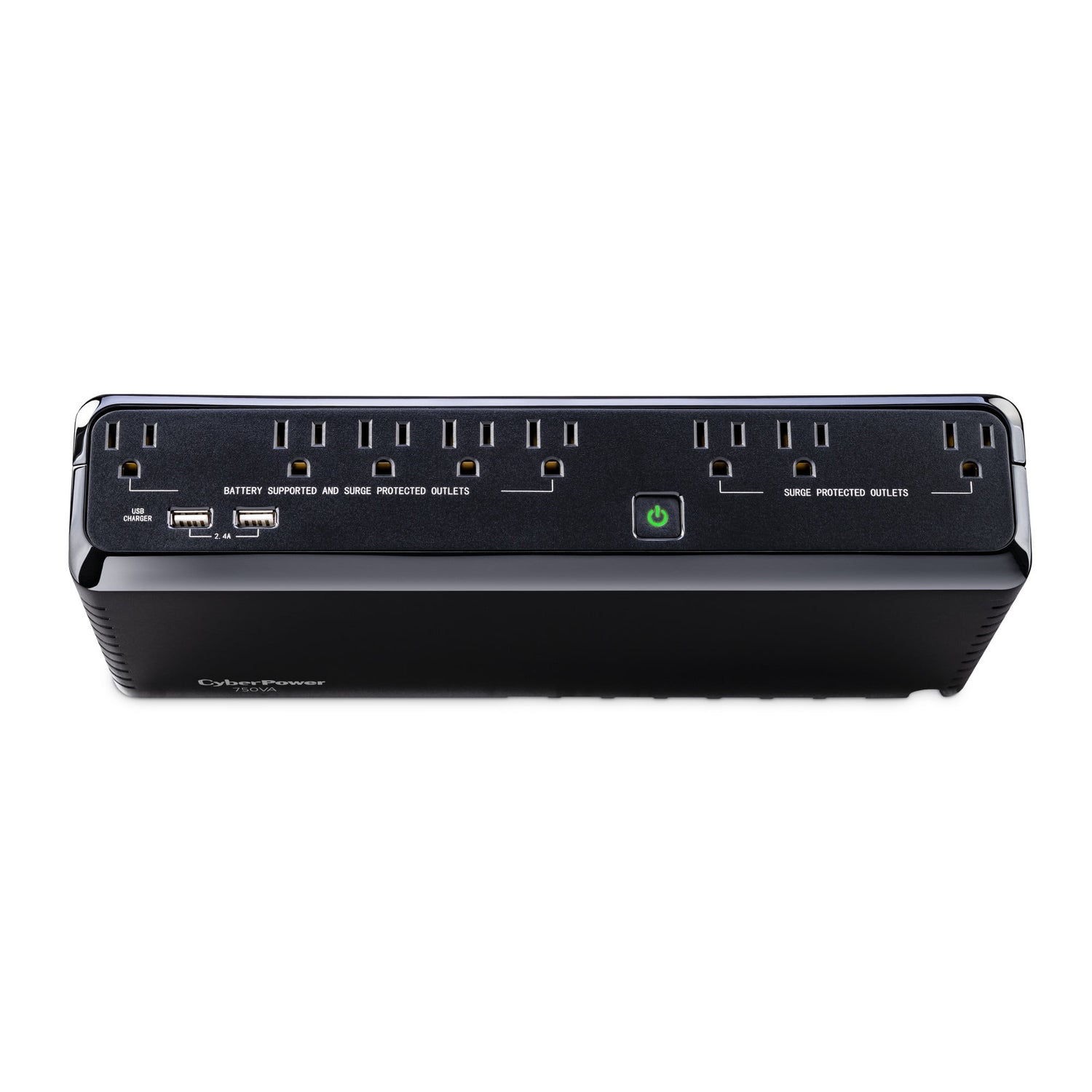 The CyberPower SL750U uninterruptible power supply (UPS) system provides surge protection for lightning-induced surges and other power events that can damage electronic equipment. This unit delivers enough battery backup to connected devices during a utility power failure, so you can perform a graceful shutdown to protect against the loss of data and damage to valuable electronics including computers, gaming consoles and home networking equipment. The SL750U has two Type-A USB charging ports with 2.4A shared total output which gives you a faster charging time and can be used while on battery backup power. The slim profile allows for discrete installation and keyhole mounting slots allow for wall-mount applications as well.