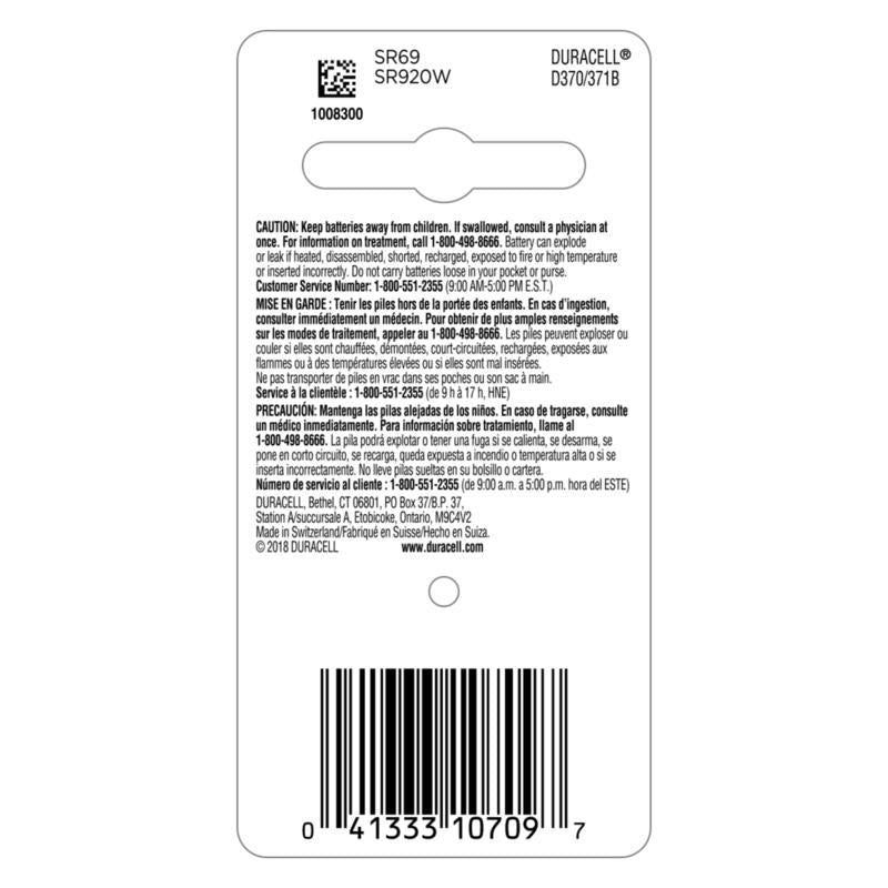 The Duracell 370/371 Silver Oxide Button battery is designed to provide reliable power to specialty devices like watches, medical devices, digital thermometers, and other electronics. Duracell 370/371 Silver Oxide Button batteries are guaranteed for 4 years in storage, so you can be confident these batteries will be ready when you need them. From storm season to the holidays, Duracell is the #1 trusted battery brand. *