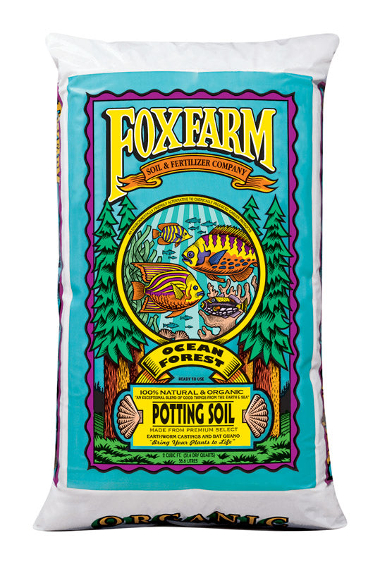 Our most popular potting soil, Ocean Forest is a powerhouse blend of aged forest products, sphagnum peat moss, earthworm castings, bat guano, fish emulsion and crab meal. Aged forest products, sandy loam and sphagnum peat moss give Ocean Forest its light, aerated texture. Start with Ocean Forest and watch your plants come alive! There's no need for nitrogen fertilizers at first; instead try FoxFarm Big Bloom Liquid Plant Food to get things started.