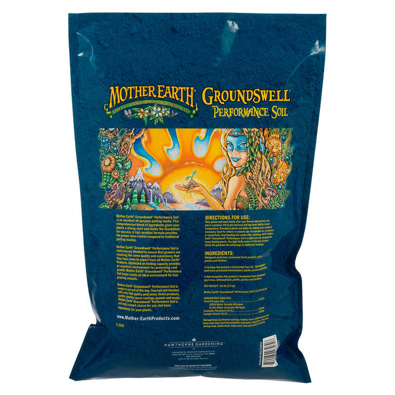 Mother Earth Groundswell Performance Soil is an all purpose potting soil for promoting root growth. This comprehensive blend of ingredients gives your plants a strong start and builds the foundation for success. A high-aeration formula provides the grower more control compared to traditional potting medias. Mother Earth Groundswell Performance Soil is meticulously blended to ensure that growers are receiving the same quality and consistency that they have come to expect from all Mother Earth products. Optimized air-holding capacity provides an excellent environment for promoting root growth. Mother Earth Groundswell Performance Soil helps create an ideal environment for fast-growing annuals. When you are ready to fertilize, Mother Earth LiquiCraft Grow and Mother Earth LiquiCraft Bloom liquid plant fertilizers work great paired with our potting soils.