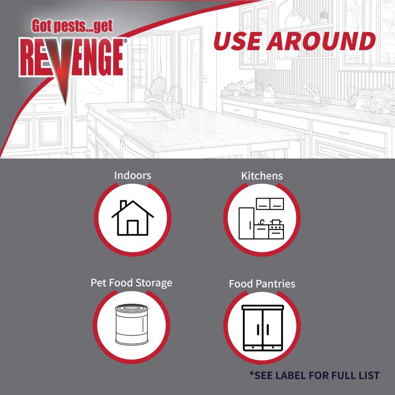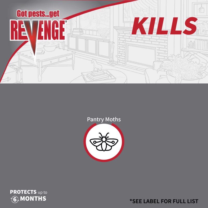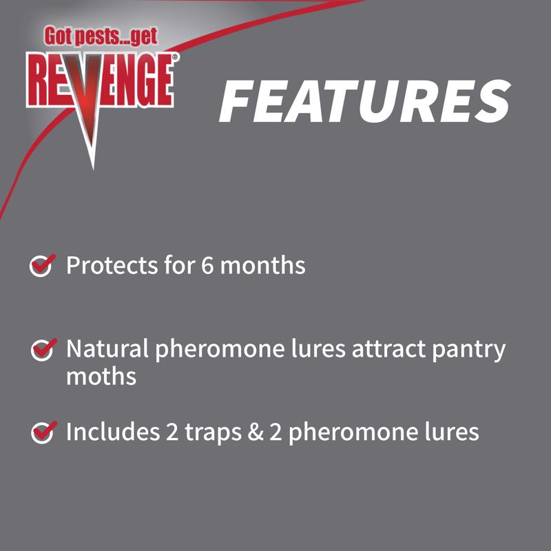 Got pests? Get Revenge with Revenge Pantry Pest Traps. This 2-pack of natural pheromone lures protects against pantry moths for up to 6 months. The natural pheromone attracts moths, and the tented sticky trap captures insects for easy disposal. Continued use of the traps will disrupt the mating and egg laying process. Pantry moths, also known as Indian meal moths, Mediterranean flour moths, almond moths and raisin moths, are commonly found in flour, rice, crackers, dog food, bird seed and cereals. The odorless traps are safe for placement around food storage areas. These traps arrive conveniently ready-to-use. To use, place near kitchen cupboards, pantry, or where pests are present. Full use instructions are provided on each trap.