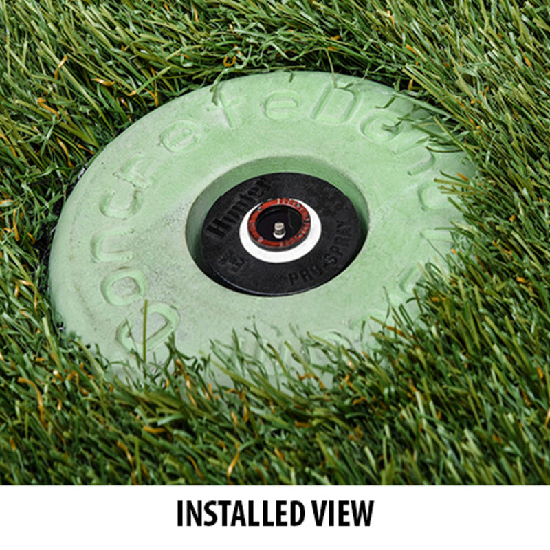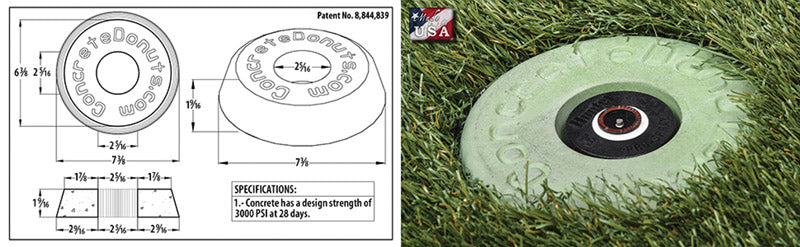 Protects the Heads from Mowers Edgers Landscapers, Teenage Drivers and tipsy mother-in-laws! Displaces the Weight of a Vehicles Tire Aiding in the Prevention of Broken Heads and Pipes. The Concrete is impregnated with Fiber for additional strength and the entire mixture is dyed green to blend with the Grass. Water Loss Prevention It aids in the prevention of the breaking of Sprinkler Heads and Pipe. The Donut is produced using the most advanced technology in Concrete mixture combinations for strength and freeze resistance