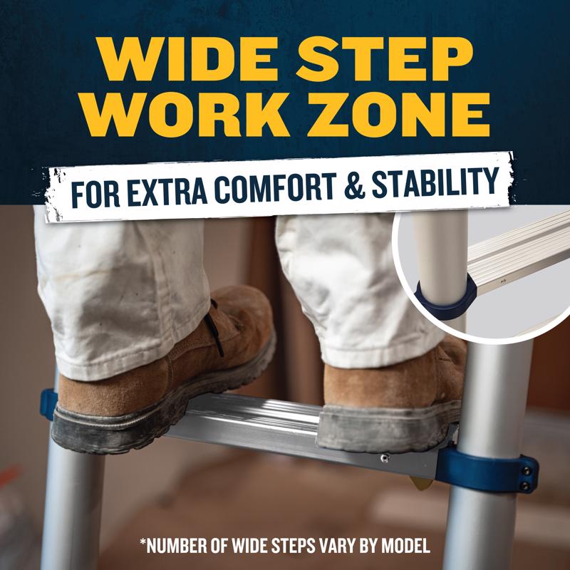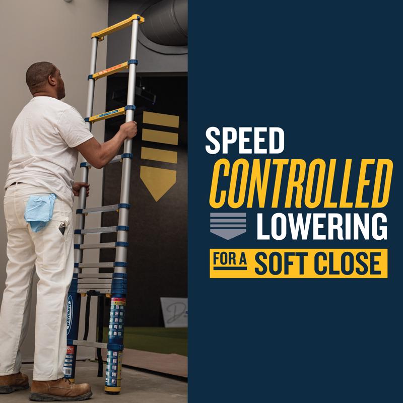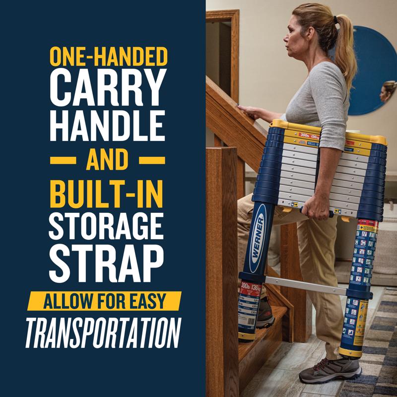 The 12.5-foot Werner Telescoping Ladder is expertly engineered for safety, stability, and to meet the demands of the job/jobsite. Featuring reinforced rail-to-rung connections, a 300-pound duty rating, and ANSI certification, this telescoping ladder offers a secure, reliable, and comfortable climbing experience. Its superior locking system includes an easy-to-read visual lock indicator, clearly showing when the ladder is fully extended, engaged, and ready for use. The one-click unlock mechanism simplifies ladder retraction, allowing for quick transitions between tasks. Speed-controlled lowering ensures safe retraction, preventing finger injuries, while the Wide Step Work Zone provides extra-wide steps for enhanced safety and comfort while working at height.