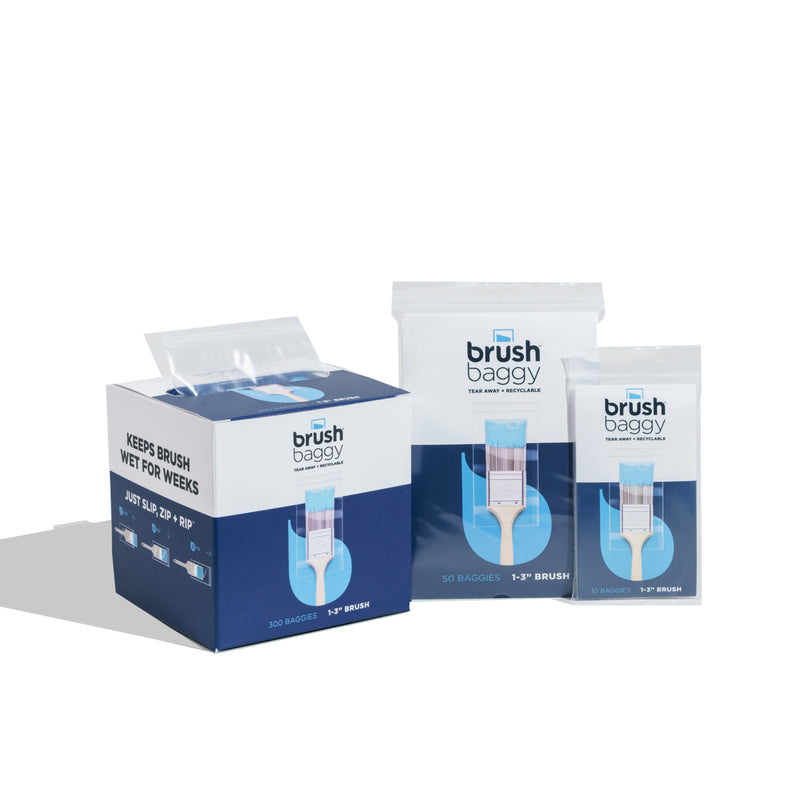 Most people agree washing their brushes isnt an enjoyable experience. BrushBaggy is a specially designed zip top plastic bag, sized to enclose your paint brushes to protect them from drying out in between uses. Save hours in washing your brushes. Protect your tools and conserve water by waiting until the end of your project to wash out your brushes. Brushes go in easy and seal air tight. Sized for a 1-3 in. brush, these baggies come in three different levels of quantities - 10 pack, 50 pack and 300 pack depending on the size of your project. Don't use messy plastic wrap or hard plastic shells that warp and still require cleaning - BrushBaggy is much better. The easy tear away design allows quick release of your brush so the paint mess is kept inside the bag - slip, zip and rip.