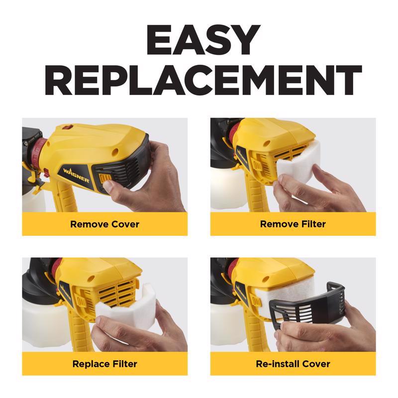 Replacement filter for standard maintenance on the following Wagner items , XTRA Duty , Double Duty , Flexio 575 , Flexio 595 and Lite Duty models. Five pack of filters in various shapes to suit your sprayer. New filters help control the air flow. Easy to change out on all sprayers listed.