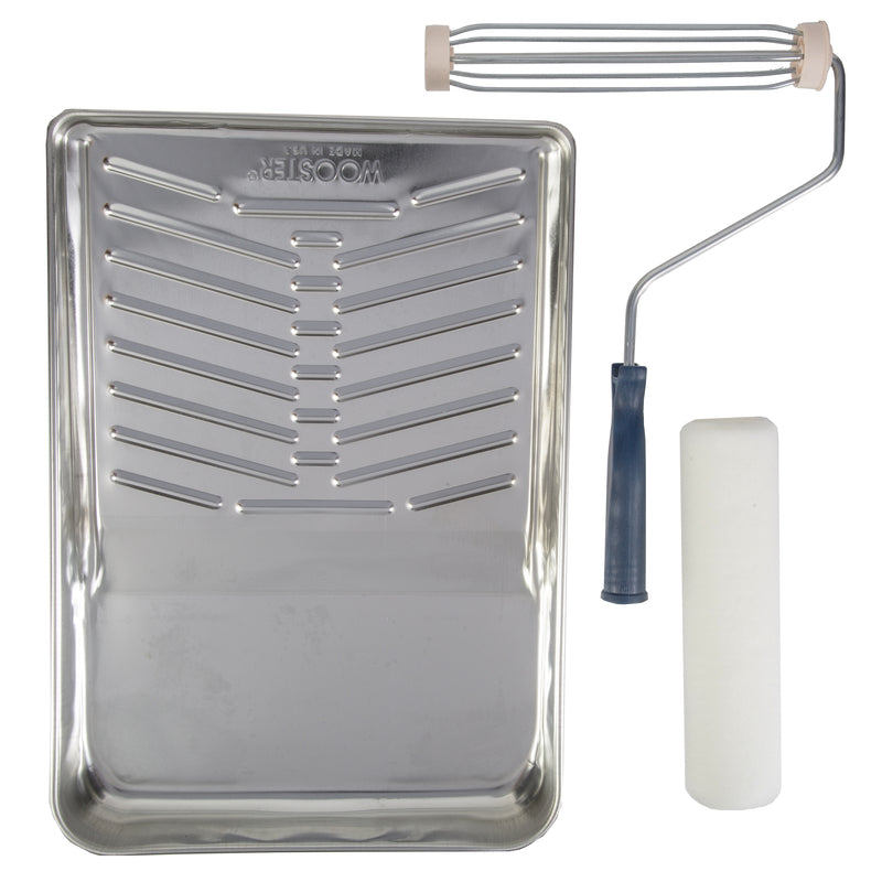 Three piece roller kit includes 9 x 3/8" Super Doo-Z roller cover, sturdy 9" roller frame with threaded grip and rust-resistant 1-quart 11" tray.