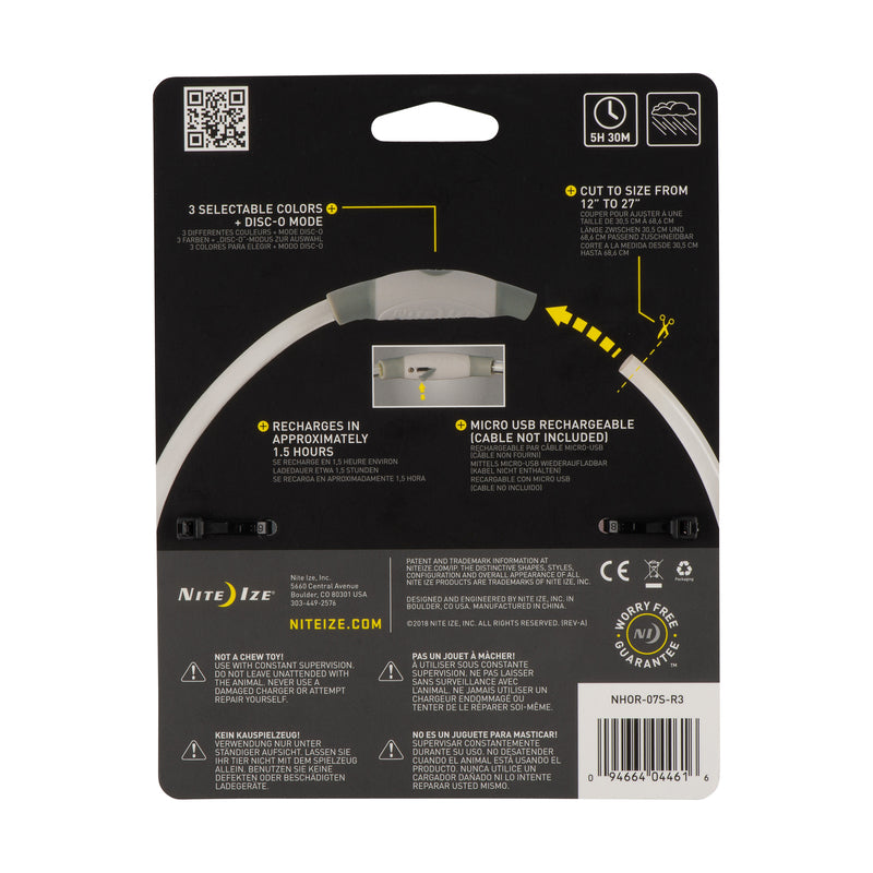 The brilliantly durable and rechargeable NiteHowl LED Safety Necklace by Nite Ize is made with flexible polymer that's illuminated by bright LEDs and can be recharged for hours of nighttime fun and safety. With Disc-O Select, this NiteHowl makes identifying multiple dogs easy with the ability to choose from one of three selectable colors (red, green, blue), plus a unique Disc-O mode that you'll have to see to believe. By illuminating the polymer with multiple colors at the same time, Disc-O mode creates a flowing color-blending pattern that's as fun as it is functional. To use the NiteHowl, simply trim the flexible polymer to a custom fit, give the button on the durable, weather resistant housing a quick press and the entire collar lights up a full 360 degrees, making your dog clearly visible from all angles.