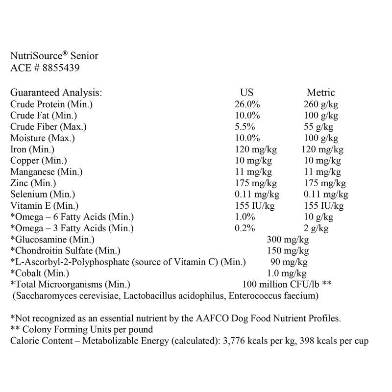 NutriSource Senior Chicken & Rice Recipe is formulated to meet AAFCO guidelines for maintenance of adult dogs. NutriSource grain inclusive formulas deliver compact nutrition and include prebiotics and probiotics to help support a healthy gut. Balanced Omega-3 and Omega-6 fatty acids along with L-Carnitine, taurine, choline chloride and DL Methionine supplementation to promote heart health make NutriSource grain inclusive formulas stand out.