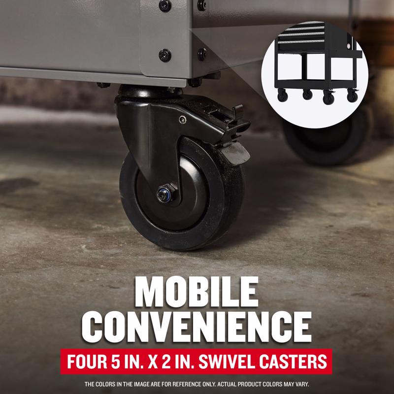 Transform your garage with the Craftsman Utility Cart. Capable of supporting up to 700 lbs. Each 22 in. deep drawer includes full-extension soft-close, ball-bearing drawer slides, drawer liners, and supports up to 100 lbs. Four 5 in. x 2 in. swivel casters help you easily move your cart where needed. Integrated charging capabilities, a secure keyed internal locking system, and a convenient pegboard make it a highly functional storage solution for your shop or garage. This versatile utility cart comes in various colors to fit your style.