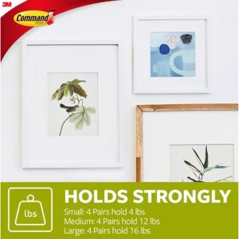 Command Picture Hanging Strips work on a variety of surfaces and make decorating quick and easy. One click tells you that the Command Picture Hanging Strip is locked in and holding tight, and when you are ready to take down or move your pictures, they come off without damaging your walls with nail holes, cracked plaster, or sticky residue. One click tells you the Command Picture Hanging Strips are locked in and holding tight. Best of all, when you are ready to take down or move your pictures, they come off cleanly with no nail holes, cracked plaster, or sticky residue. Command Picture Hanging Strips come in three sizes: Small strips hold most 8 in. by 10 in. frames, medium strips hold most 18 in. by 24 in. frames, and large strips hold most 24 in. by 36 in. frames. Also available are Command Frame Stabilizer Strips which keep picture frames level even if hung by nails.