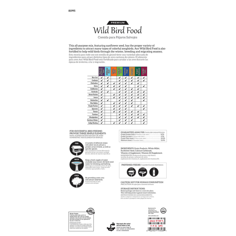 Ace premium wild bird food. Mix attracts bluebirds, cardinals, chickadees, grosbeaks, blue jays, nuthatches, finches, sparrows and other desirable birds.